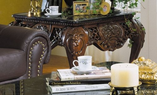 The exquisite detail of the Gladstone End Table provides it with a grandeur sure to fortify the elegance of an upscale traditional living area. Splendid with it's ornately boutique-motif carved apron and similarly ornate cabriole legs, the Gladstone is all the more beautiful with a large black marble table top on beaded table trim. A rich dark cherry finish completes the look powerful appeal of the Gladstone Square End Table. Features: End Table features top-quality solid hardwood construction End Table has a dark cherry wood finish Black Marble table top Extensive carved detail Cabriole turned legs Specifications: Overall dimensions: 27" H x 38" W x 38" D