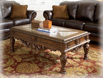 A deep rich finish and exquisite details come together to create the ultimate in grand traditional design of the "North Shore" accent table collection. The opulent brown finish flows beautifully over the decorative details to create a rich elegant atmosphere to any home environment. With beveled inlay marble inserts on the coffee table top, this furniture collection takes traditional style to the next level. Transform your living area with the rich style of the "North Shore" accent table collection.