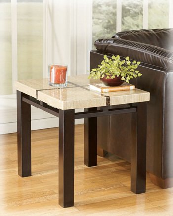 Faux travertine thick top has a durable polyurethane finish. Legs and apron feature a dark brown finish. Solid wood legs. Dimensions: